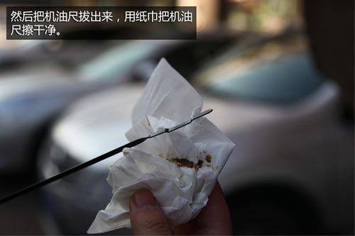 2.把機油尺拔出來,用紙巾把機油尺擦干凈。