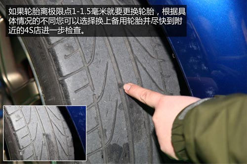 3.其次要檢查輪胎的側面及接地部分是否有明顯的損傷,胎紋間是否有石子等異物以及輪胎是否磨損過度。如果離極限點1-1.5毫米就要更換輪胎,根據具體情況的不同您可以選擇換上備用輪胎并盡快到附近的4S店進一步檢查。