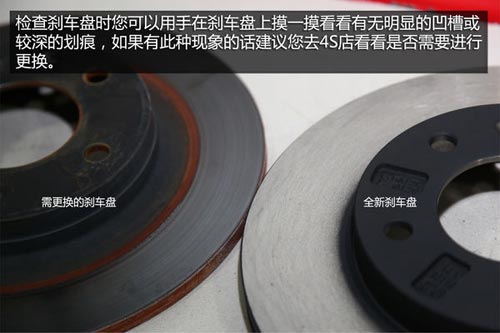 3.檢查剎車盤時您可以用手在剎車盤上摸一摸看看有無明顯的凹槽或較深的劃痕,如果有此種現象的話建議您去4S店看看是否需要進行更換。