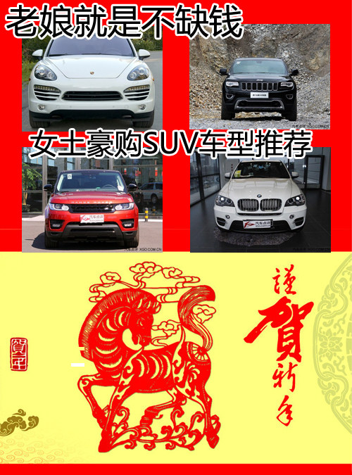 筆者先在這里祝大家“馬上有錢”,新的一年事業(yè)蒸蒸日上,闔家團(tuán)圓,來(lái)年順順利利,身體健健康康!祝福過(guò)后,繼續(xù)為大家推薦同為女土豪但性格各不相同時(shí),要選擇什么車型呢?本次為大家?guī)?lái)的車型有寶馬X5,路虎攬勝運(yùn)動(dòng)版,保時(shí)捷卡宴,Jeep大切諾基。