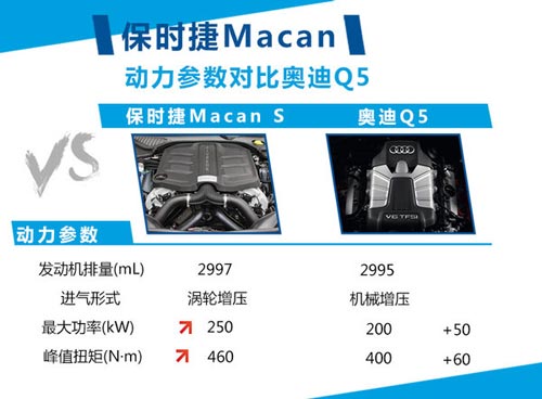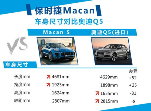 根據保時捷官方的信息,在今年率先引入國內的Macan車型,將分為Macan S與Macan Turbo兩款車型,其中Macan S搭載了與進口奧迪Q5排量相同的3.0T引擎。今天我們就將其與進口奧迪Q5車型進行對比。從上圖中,我們可以看到保時捷Macan車型在長度與寬度相比更具優勢,但是車輛高度將有所降低,此外軸距相比進口奧迪Q5短8mm。
