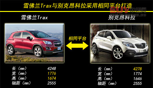雪佛蘭Trax與別克昂科拉采用相同平臺打造,車身尺寸方面,該車型的長/寬/高分別為4248mm/1776mm/1674mm,較昂科拉相比,Trax除車身長度方面短30mm,寬和高均略大于上述車型,而2555mm的軸距兩款車型則保持一致。