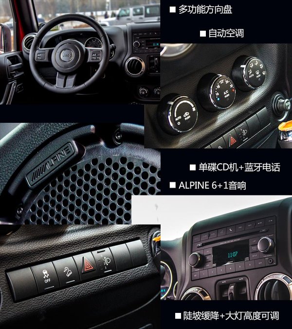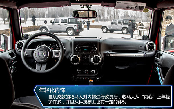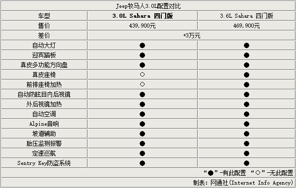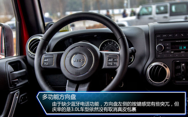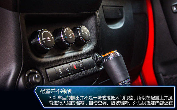 可以明確說明的是,雖然3.0L牧馬人排量低,價格下調,但是配置方面仍沒有大幅縮減,在3.6L車型上的大部分配置全部保留,只是真皮座椅和前排座椅加熱進行了減裝,不過對于相差3萬元的售價來說,缺少的配置算不上有多重要。