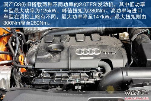 動力方面,國產奧迪Q3搭載與進口車型相同的動力系統,其中35TFSI搭載的是編號為CRH型的2.0T發動機,其最大功率為125kW,另一款則是高功率版本的40TFSI型,發動機編號為CGM型,最大功率為147kW。