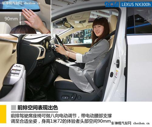 從實際體驗看,大長腿妹子對雷克薩斯NX的前排空間表示滿意,頭頂有90mm的空余,雖然是SUV式的高坐姿,但空間感開闊,不會給人壓抑感。