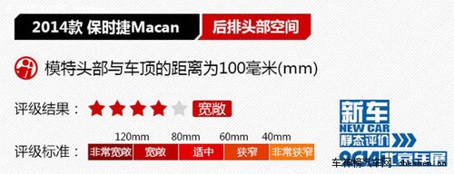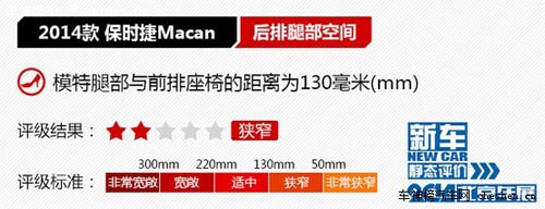 當(dāng)模特移到后排后,頭部的空間為100毫米,基本和前排頭部空間差不多,而腿部空間為130毫米,這在我們的評價標(biāo)準(zhǔn)中只達到了狹窄標(biāo)準(zhǔn)的上限,尤其這又是一款保時捷的SUV,人們對其空間的期待較高,難怪所有乘客都對其后排空間感到不滿意了。
