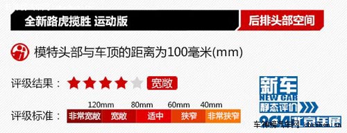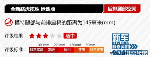 由于現(xiàn)場的條件有限,所以我們僅針對兩項空間評級得分,綜合得出空間評價結(jié)果,后排腿部空間7.5分、后排頭部空間4.5分,綜合空間總分12分。分項各級別對應(yīng)分?jǐn)?shù):