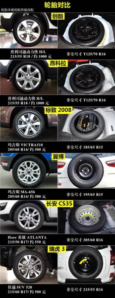 6款車型無一例外都采用非全尺寸備胎,其中創(chuàng)酷和昂科拉還是"T"型備胎,安全系數(shù)偏低,有些不太給力。另外,瑞虎3和標(biāo)致2008的拋光輪轂造型最為帥氣,運(yùn)動(dòng)感較強(qiáng),而昂科拉和創(chuàng)酷就差了一籌。