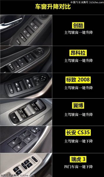 車窗一鍵升降功能雖然關(guān)注度不高,但卻是凸顯人性化體驗(yàn)的重要細(xì)節(jié)。在6款車型中,創(chuàng)酷、昂科拉、標(biāo)致2008以及翼搏都只有主駕駛座車窗帶一鍵升降,其它為手動(dòng)車窗。瑞虎3四門車窗支持一鍵下降,但不支持一鍵升窗。而長安CS35僅主駕駛帶一鍵下降功能,人性化體驗(yàn)最差。