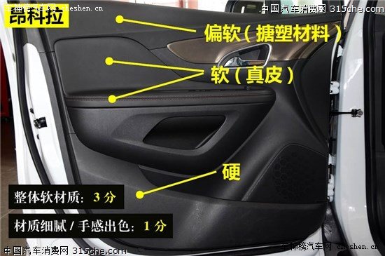門板材質(zhì)是廠家做工用料是否厚道的直接反映。在6款車型中,值得表揚(yáng)的是昂科拉,整個(gè)門板上層都采用軟材料,中間真皮包裹的觸感很舒適,這也是較高價(jià)格所換來的特殊價(jià)值。第二個(gè)要表揚(yáng)的是標(biāo)致2008,雖然只有扶手采用軟材質(zhì),不過真皮質(zhì)感很不錯(cuò)。而創(chuàng)酷、長安CS35和瑞虎3表現(xiàn)中規(guī)中矩。最應(yīng)該批評(píng)的是翼搏,扶手包裹的是織物面料,顯得很廉價(jià)感。