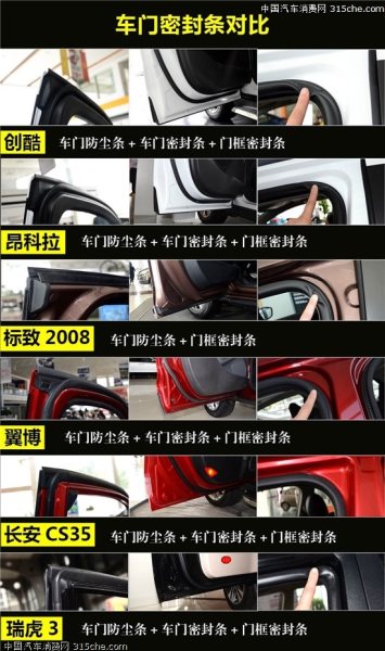 6款小型城市SUV中,有5款車型三項(xiàng)都表現(xiàn)出色,車門密封條、防塵條以及門框密封條都有配備,特別是作為自主SUV的長安CS35和瑞虎3,與合資SUV相比沒有區(qū)別。唯一丟分的是標(biāo)致2008,沒有車門密封圈,但門框密封圈是6款車中最厚實(shí)的。法系車的設(shè)計(jì)和其它車型有些不同,在世嘉和408也碰到過這種情況。