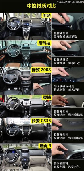 在中控臺(tái)材質(zhì)用料方面,昂科拉依舊保持領(lǐng)先優(yōu)勢,中控臺(tái)采用偏軟的搪塑,手感舒適,整體做工也非常不錯(cuò)。緊隨其后的是標(biāo)致2008,中控用料新穎,采用軟帆皮材質(zhì),觸感很好。接下來是創(chuàng)酷,中控雖然硬塑料,不過紋理較有質(zhì)感。翼搏和長安CS35兩款中控同樣為硬塑料,質(zhì)感相比創(chuàng)酷差了一絲。瑞虎3的硬塑料材質(zhì)和翼搏、CS35沒有區(qū)別,只是內(nèi)飾造型有些老氣,所以排在最后。
