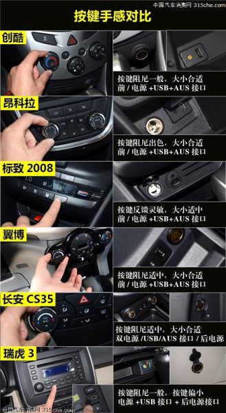 在中控按鍵布局和手感方面,昂科拉和標(biāo)致2008都優(yōu)于其它車型,按鍵反饋靈敏、阻尼到位,只是昂科拉按鍵設(shè)計(jì)偏小,不便于駕駛中操作。創(chuàng)酷、翼搏和CS35的按鍵阻尼和反饋感基本相差無幾,不會(huì)影響實(shí)用性。瑞虎3整體表現(xiàn)略差一籌。創(chuàng)酷、昂科拉、標(biāo)致2008以及翼搏都在前排配備電源接口、USB接口以及AUX接口,滿足基本日常需求。瑞虎3前排沒有配備AUX接口,不過后備箱增加電源接口。而長安CS35在前排配備雙電源接口、AUS接口以及USB接口,同時(shí)后備箱還配備電源接口值得表揚(yáng)。