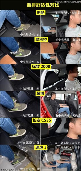 后排中央乘坐舒適度方面,自主品牌陣營的瑞虎3和長安CS35較有優(yōu)勢,瑞虎3和長安CS35后排中央地板只有小幅坡度,同時(shí)長度也足夠雙腳并攏放在上面,長時(shí)間乘坐不會(huì)太累。另外,瑞虎3還配備后排中央頭枕和中央扶手,舒適度較好。創(chuàng)酷和昂科拉兩車后排中央乘坐舒適度僅次前者。而標(biāo)致2008和翼搏的后排中央地板太窄,雙腳基本不能放在上面。