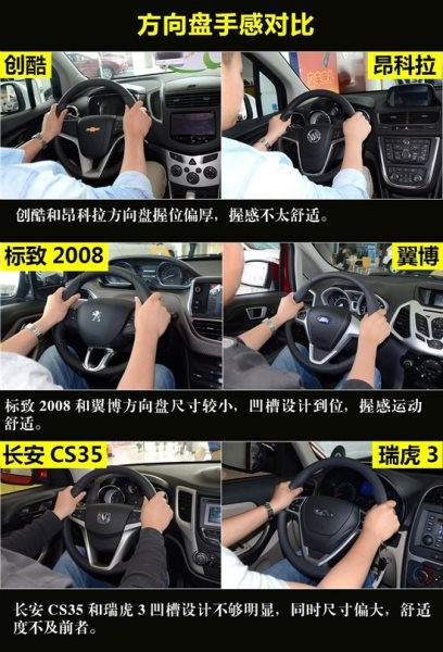 6款車型中翼搏和標(biāo)致2008的方向盤握感最舒適,方向盤尺寸較小,運(yùn)動(dòng)感也很強(qiáng)烈。創(chuàng)酷和昂科拉方向盤握位偏厚,不太舒適。長安CS35和瑞虎3方向盤凹槽不夠清晰,同時(shí)尺寸偏大,舒適性一般。