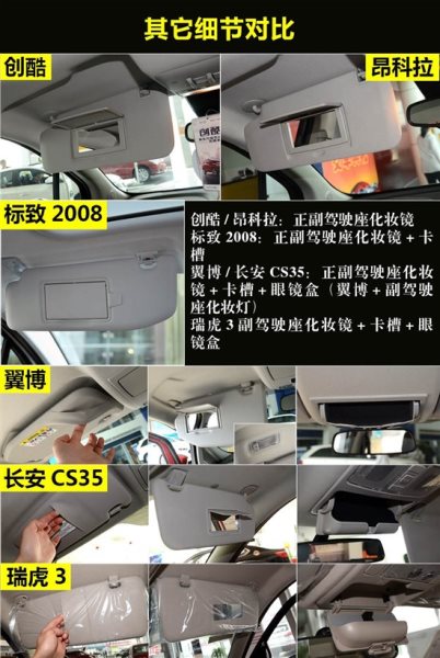 翼搏和長安CS35都配備正副駕駛座化妝鏡、卡槽以及眼鏡盒,其中翼搏還有副駕駛座化妝燈,細(xì)節(jié)設(shè)計(jì)到位。瑞虎3同樣配備眼鏡盒,只是主駕駛沒有化妝鏡。創(chuàng)酷、昂科拉以及標(biāo)致2008都只有正副駕駛座化妝鏡。