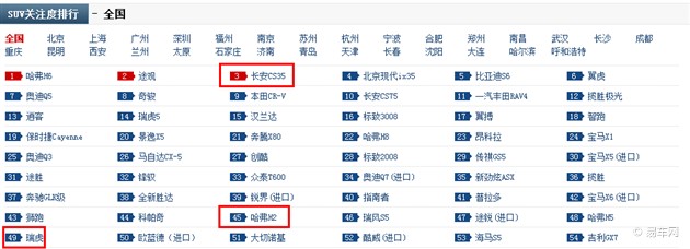 通過對于車型價格和空間以及動力的比較來看,CS35和瑞虎也確實將是H2未來上市后,在自主品牌市場上的主要競爭者。從易車網的SUV關注度排行中我們發現,這三款自主車型均已躋身前50名的行列,這也是對于自主品牌的一種肯定和鼓勵。