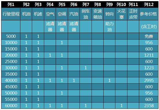 | 行駛里程 | 機油 | 機濾 | 空氣 | 空調 | 汽油 | 剎車油 | 變速箱油 | 轉向 | 火花塞 | 正時皮帶 | 參考價格 |