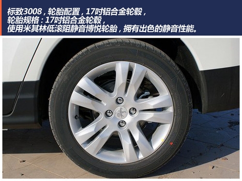 標致3008標配17吋鋁合金輪轂,使用米其林低滾阻靜音博悅輪胎,擁有出色的靜音性能。