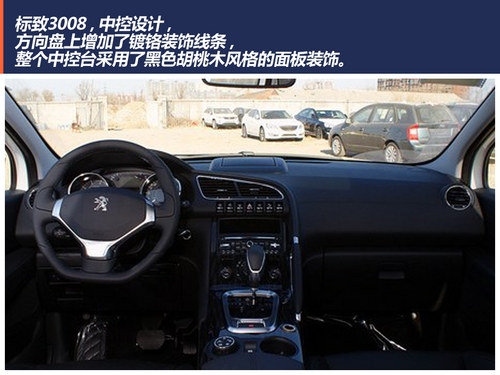 標致3008方向盤上增加了鍍鉻裝飾線條,整個中控臺采用了黑色胡桃木風格的面板裝飾。高配版本在前風擋玻璃下方設計了抬頭信息顯示屏幕。另外,中控臺空調出風口上方帶有折疊式的彩色液晶屏,主要是升級了GPS導航系統。