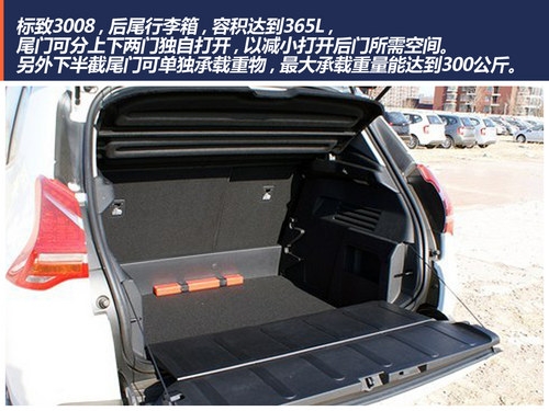 標致3008尾門可分上下兩門獨自打開,以減小打開后門所需空間。另外下半截尾門可單獨承載重物,廠商給出的承載重量為200公斤,據說這還是保守數字,最大甚至能達到300公斤。