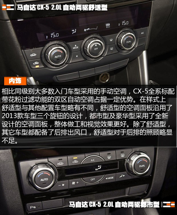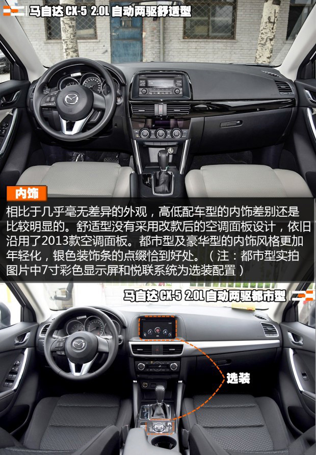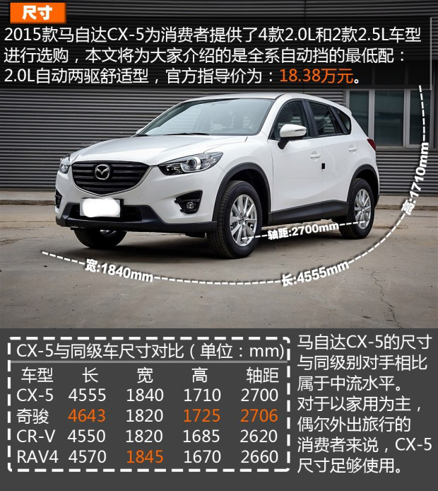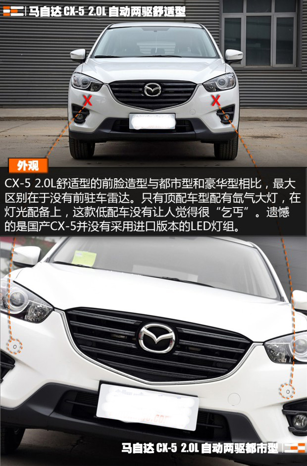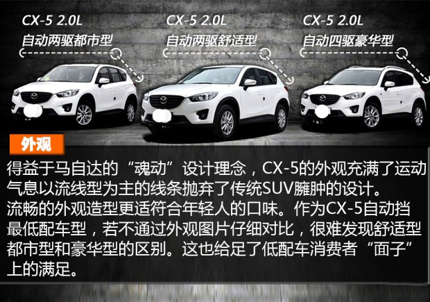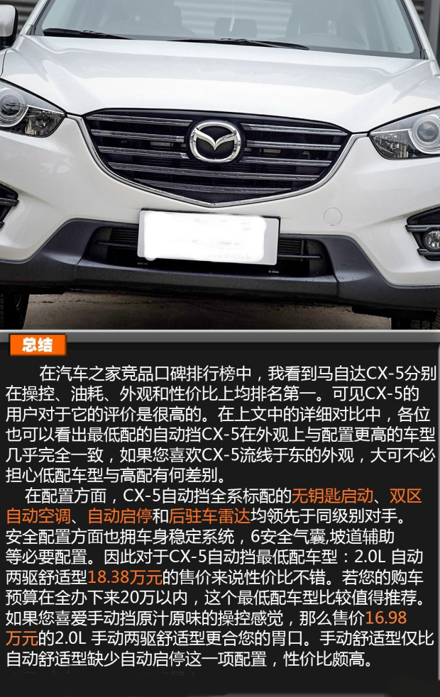 “我預算全辦下來20萬,想買輛SUV,你看哪款值得推薦”。這是我最近被問到最多的問題。作為一名汽車編輯,對于這個問題我還真的不好回答,因為可選擇的太多了。從這些購車咨詢中,也不難看出對于消費者來說SUV的誘惑力有多大。今天我就帶大家看一輛20萬以內能開回家的SUV車型:馬自達CX-5 2015款 2.0L 自動兩驅舒適型(官方指導價18.38萬元)看看它是否符合您的預期。作為馬自達CX-5自動擋的最低配車型它18.38萬元的售價性價比怎么樣?與比它配置更高的2015款 2.0L 自動兩驅都市型(官方指導價:19.08萬元)和2.0L 自動四驅豪華型(官方指導價:20.98萬元)又有怎樣的差異呢?看完這篇解讀低配車或許您心中會有個答案。(注:文章內將2015款 2.0L 自動兩驅舒適型簡稱舒適型、自動兩驅都市型簡稱都市型、自動四驅豪華型簡稱豪華型)