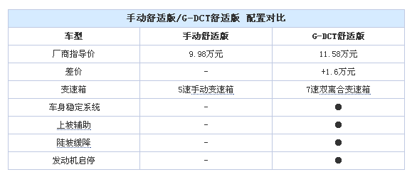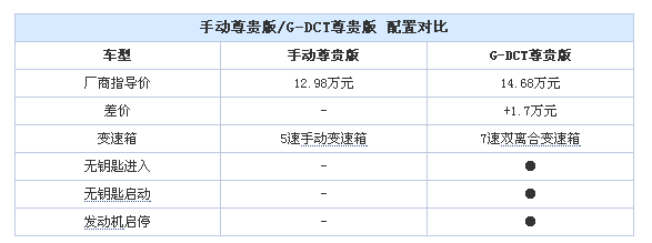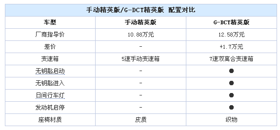 從手動豪華版車型升級到自動擋車型G-DCT豪華版的差價是1.9萬元,除了變速箱的差異之外還包括了輪胎和輪圈的升級、無鑰匙進入和啟動功能以及G-Link智能手機互聯功能。用接近兩萬塊錢升級成自動擋還是顯得代價比較高,不過考慮到配置上比G-DCT精英版高不少,所以手頭比較富余的消費者選擇它也不錯。
