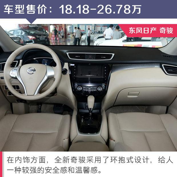 在內飾方面,全新奇駿采用了環抱式設計,給人一種較強的安全感和溫馨感。大面積軟質材料的包裹,在做工和手感方面都屬上乘。移動大沙發的外號絕對不是吹的,座椅柔軟和舒適度堪稱一絕。值得一提的是,中央大屏幕為日產最新的CARWINGS智能服務系統,集成了導航、實時路況、車況監測、遇險自救、車輛侵入報警、接線員語音對話等,功能非常強大。在其它配置方面,它還有胎壓監測、無鑰匙啟動/進入、陡坡緩降、全景天窗、座椅加熱、LED大燈、電動尾門、自動泊車、并線輔助/車道偏離、全景攝像頭等,非常豐富。