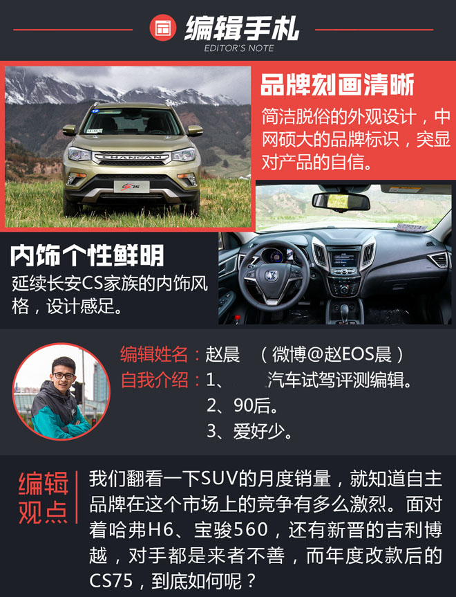 【SUV中國網】在SUV市場上,從來都不缺少競爭對手,無論是合資品牌,還是自主品牌。哈弗H6不斷刷新著銷量榜的最佳戰績,而寶駿560黑馬一般的閃現也再次證明,SUV市場上,永遠只有你想不到的。當人們的選擇從合資轉向自主時,這個市場似乎也變得更為生機勃勃,備受關注的吉利博越千呼萬喚始出來,好像所有人的目光齊刷刷的投向了它,但是,別忘了它,長安CS75,通過改款、升級,它似乎也帶著一股不服氣的勁兒來了,目的很簡單,試著把那個“網紅”拉下水。