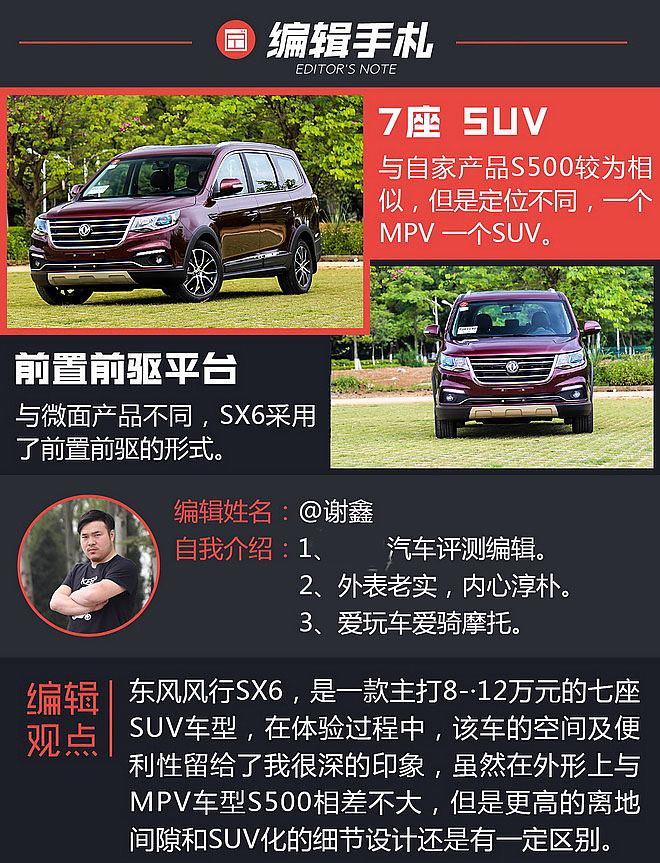 沒那么多錢怎么辦,不想要小面式的MPV,太沒性格?今天來一有性格的車,東風風行SX6,定位SUV車型,7座車型,并且座椅布局還是2+2+3,沒見過吧!(注:此次試駕車型并未最終量產車型)