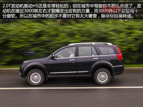 2013款哈弗H5 搭載三菱代號4G63S4T的,2.0L渦輪增壓汽油發動機。這款發動機推動H5還是非常輕松的,但在城市中駕駛卻不那么合適了,發動機在接近3000轉左右才能爆發出應有的力量,而3000轉以下卻顯得十分疲軟。所以在城市中的起步不要對它有太大奢望,除非你舍得去拉高轉速,讓渦輪介入,介入后動力輸出還是非常可觀的。