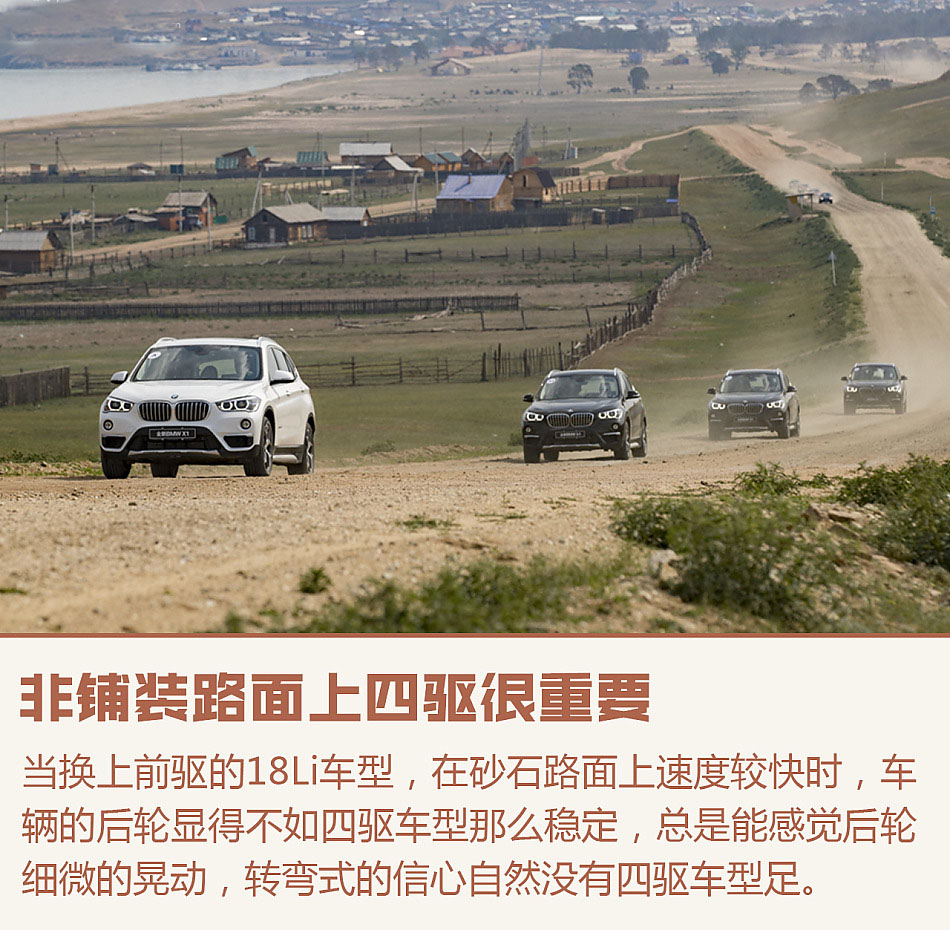 在貝加爾湖波光粼粼的水面旁,我們完成了全新X1的短暫試駕,與慣常的試駕不盡相同,這次寶馬勇敢的將國產(chǎn)車?yán)胶M猓€在這樣一個極限的路況下穿山越嶺,除了為這美麗的意境,更多的像是在挑戰(zhàn)和證明。挑戰(zhàn)世俗的眼光,挑戰(zhàn)人們對SAV車型的觀念,同時也為證明X1的能力遠(yuǎn)不止緊湊級城市SUV那么簡單。