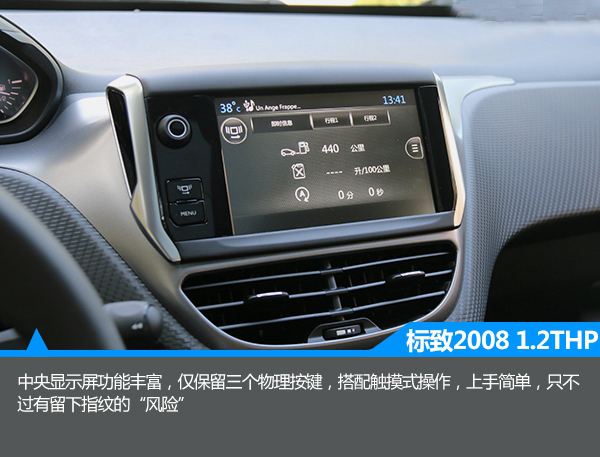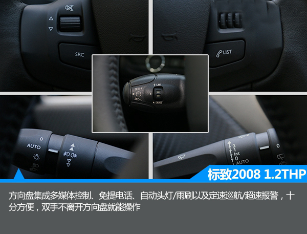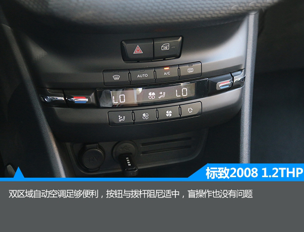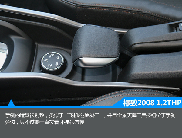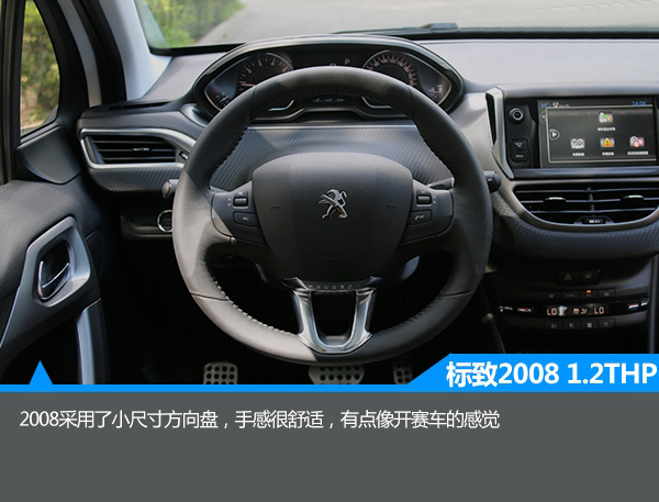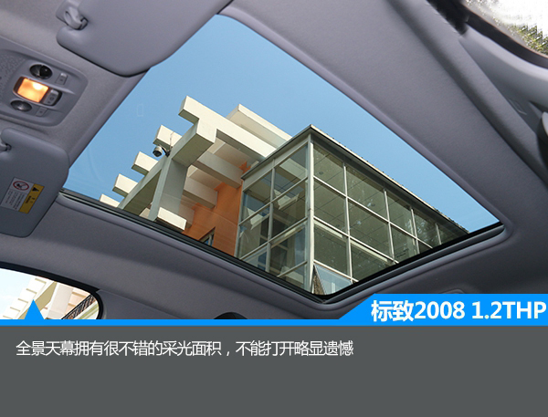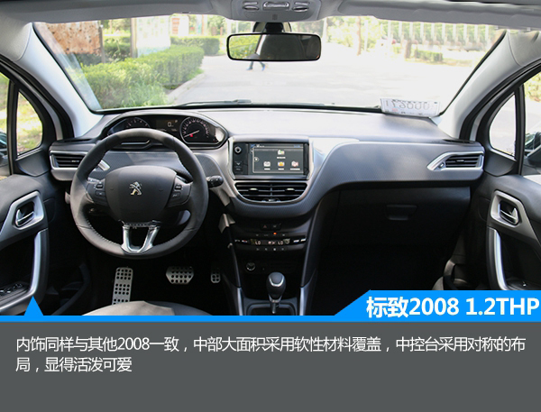 1.2T版本同樣與之前的版本基本保持一致,中控臺被大面積軟性材料覆蓋,顯得誠意十足。此外,中控臺采用了對稱式的設計,由上至下分別為集成大部分功能的液晶屏,僅保留三個物理按鍵的設計也簡潔明了,而雙區域自動空調的配備顯得誠意十足。此外,與一般車型相比,2008的方向盤尺寸很小,握感很舒服,有一種開賽車的感覺。與此同時,該車還配備了全景天窗,有很大的采光面積,不過不能開啟略顯遺憾。