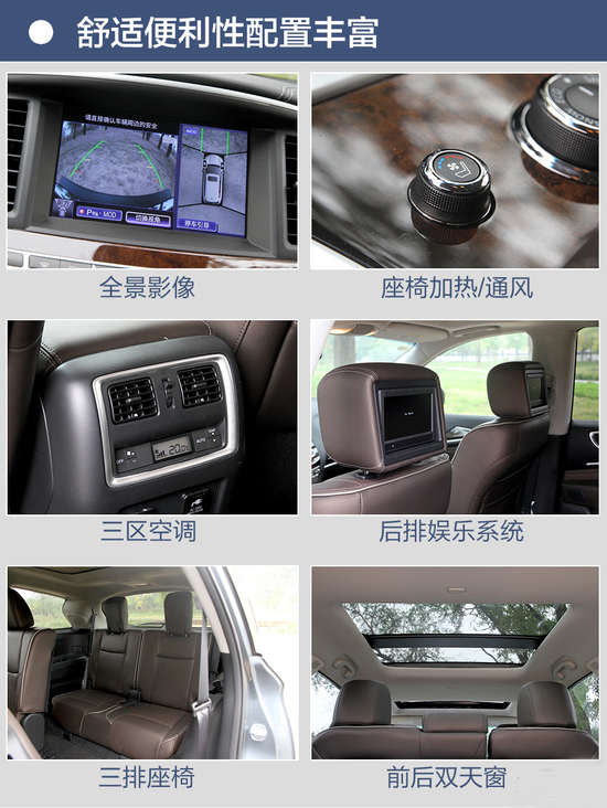豐富的舒適便利性配置是居家車型不可或缺的特點(diǎn),英菲尼迪QX60提供了三區(qū)空調(diào)、前后雙天窗、座椅通風(fēng)和加熱、后排娛樂系統(tǒng)、全景影像等功能,再加上7座的設(shè)定,全家一起出行可以做到很舒適。