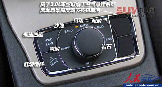 3.0L車型的四驅(qū)系統(tǒng)與3.6L車型一樣,同樣搭載了Quadra-Trac全時四驅(qū)系統(tǒng),中央采用多片離合器式限滑差速器,每個車輪都是通過電子輔助來實現(xiàn)鎖止的。分動箱帶有扭矩放大擋,當(dāng)需要時可以給車輛提供更大的扭矩,保證其自身的脫困性。