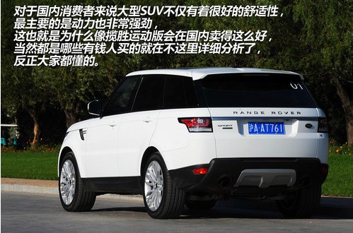 從車身尺寸上看,長寬高分別為:4850毫米×1983毫米×1780毫米的新款攬勝運動版,絕對算得上是個大塊頭。對于許多國內(nèi)消費者來說,大型SUV在駕乘方面不僅有著很好的舒適性,最主要的是動力也非常強勁,這也就是為什么像攬勝運動版會在國內(nèi)賣得這么好,當(dāng)然都是哪些有錢人買的就在不這里詳細分析了,反正大家都懂的。