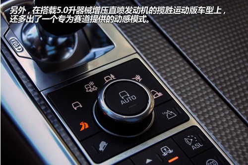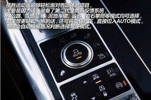 攬勝運動版能夠輕松面對各項體驗項目,主要是因為該車裝備了第二代全地形反饋系統(tǒng),從公路、雪地濕滑、泥地車轍、沙地、巖石攀爬等模式均可進行選擇,如果想更輕松一點的話,還可將旋鈕按下,直接切入AUTO模式,系統(tǒng)會自動根據(jù)路況判斷選擇駕駛模式。另外,在搭載5.0升器械增壓直噴發(fā)動機的攬勝運動版車型上,還多出了一個專為賽道提供的動感模式。