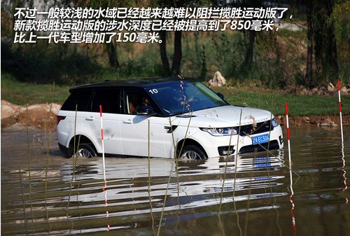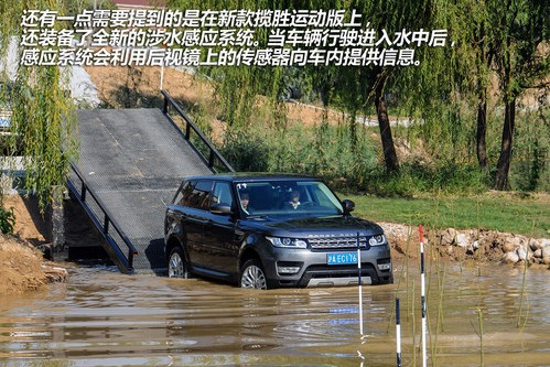還有一點需要提到的是在新款攬勝運動版上,還裝備了全新的涉水感應(yīng)系統(tǒng)。當(dāng)車輛行駛進入水中后,感應(yīng)系統(tǒng)會利用后視鏡上的傳感器向車內(nèi)提供信息。不過一般較淺的水域已經(jīng)越來越難以阻攔攬勝運動版了,新款攬勝運動版的涉水深度已經(jīng)被提高到了850毫米,比上一代車型增加了150毫米。