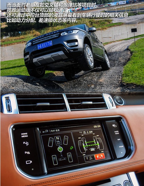 而當(dāng)面對老朋友如交叉軸和炮彈坑等項目時,攬勝運動版不僅可以輕松通過,還可通過中控臺頂部的液晶屏幕看到車輛行駛時的相關(guān)信息,比如動力分配、差速鎖狀態(tài)等內(nèi)容。
