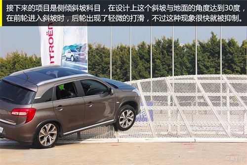 在側傾斜坡這種較高難度的道具面前,C4 AIRCROSS顯得就不是那么游刃有余,在進入的瞬間明顯感覺右后車輪在打滑,也就在開始打滑不久,車輛自帶的制動力電子控制系統就會進行空轉車輪的剎車,有效的減少了動力的浪費。