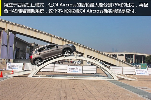此次試駕中廠家設置的駝峰橋對于一些越野車來說并不是十分夸張,不過對于城市SUV來說就不免有些吃力,C4 AIRCROSS正是如此,好在它還有一套電控的四驅鎖定擋,通過這個擋位的作用,在較為充沛的動力配合下,最終還是征服了這個科目。不過作為城市SUV,咱們還能要求它什么呢。