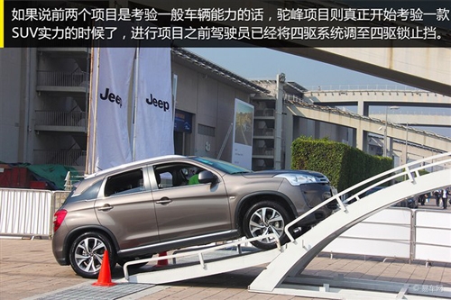 如果說前兩個項目都不太能顯現SUV車型的優勢的話,那真正的考驗可能就要從駝峰橋開始了,駝峰橋作為越野場地賽的經典項目,對車輛的接近角、離去角、離地間隙以及軸距長短的要求都相當高。