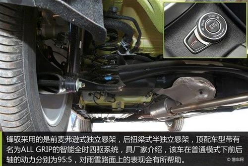 底盤方面鋒馭采用了前麥弗遜式獨立懸架,后扭梁式半獨立懸架。另外值得一提的是,鋒馭是鈴木國產(chǎn)的第一款四驅(qū)車型,該車型搭載了鈴木的ALL GRIP全時智能四驅(qū)系統(tǒng),可通過擋把后方的駕駛模式進行切換,擁有雪地模式、運動模式等,從而滿足不同的路況需求。