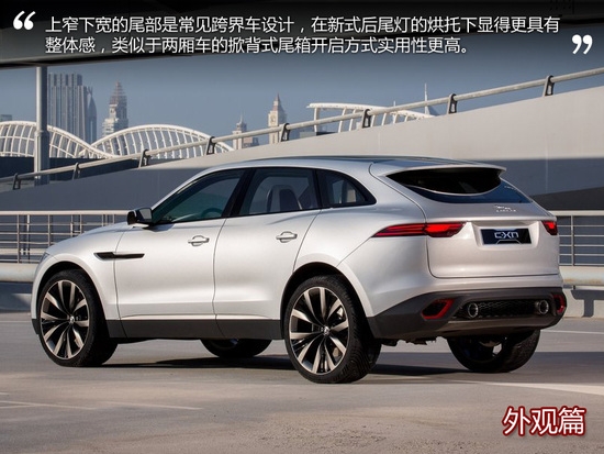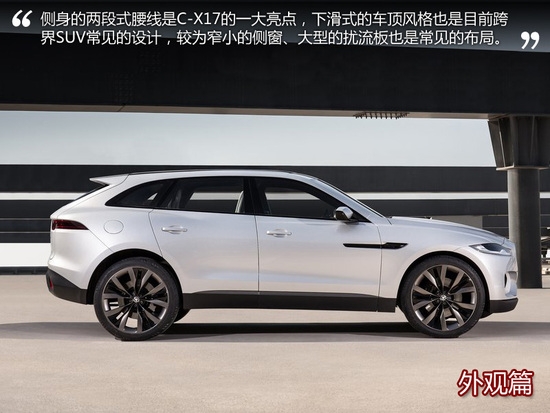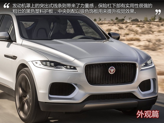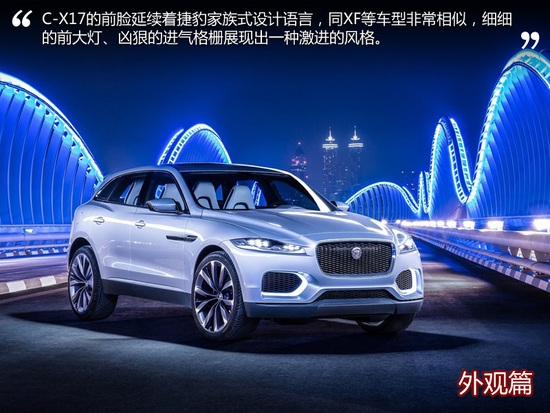 設(shè)計(jì)方面,C-X17的前臉延續(xù)著捷豹家族式設(shè)計(jì)語(yǔ)言,同XF等車型非常相似,細(xì)細(xì)的前大燈、兇狠的進(jìn)氣格柵展現(xiàn)出一種激進(jìn)的風(fēng)格。引入新式的LED等組織后,這種感覺得到了增強(qiáng)。
