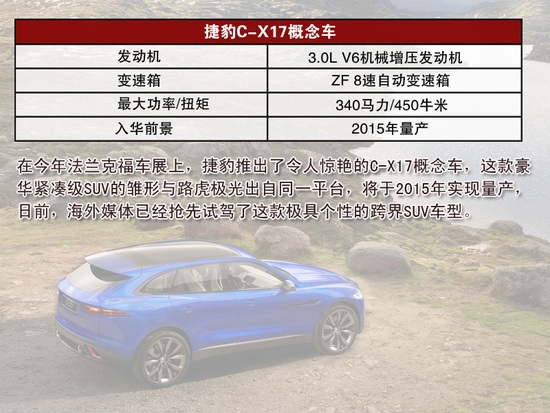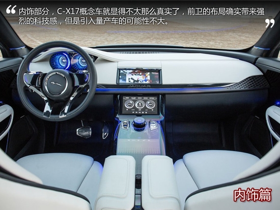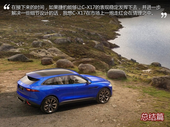 對(duì)于競(jìng)爭(zhēng)對(duì)手Macan,C-X17有著同樣出色的操控性能,機(jī)上極具個(gè)性的外觀和品牌定位,顯然會(huì)掀起一場(chǎng)緊湊級(jí)豪華SUV車市的旋風(fēng)。在接下來(lái)的一年多時(shí)間里,如果捷豹能夠讓C-X17的表現(xiàn)穩(wěn)定發(fā)揮下去,并且進(jìn)一步解決一些細(xì)節(jié)設(shè)計(jì)的話,我想C-X17在市場(chǎng)上一炮走紅會(huì)在情理之中。