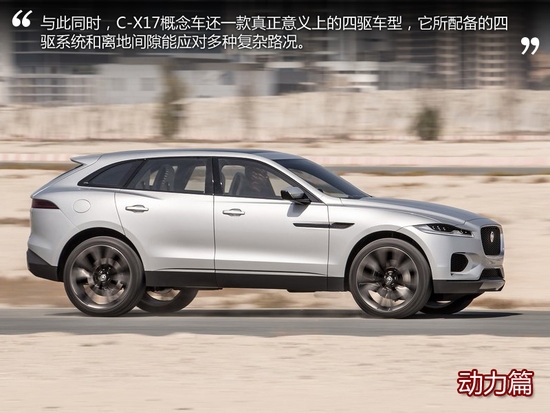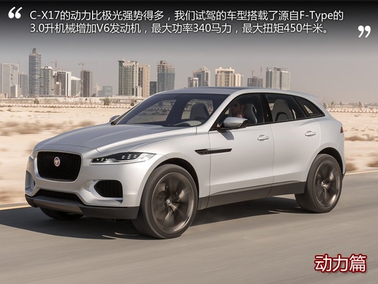 既然是一款主打性能的車型,C-X17的動(dòng)力比極光強(qiáng)勢(shì)得多,我們?cè)囻{的車型并沒有采用源自福特的那臺(tái)240馬力的2.0T發(fā)動(dòng)機(jī),而是采用了那臺(tái)源自于F-Type上的3.0升機(jī)械增加V6發(fā)動(dòng)機(jī),輸出功率達(dá)到340馬力,輸出扭矩450牛米。