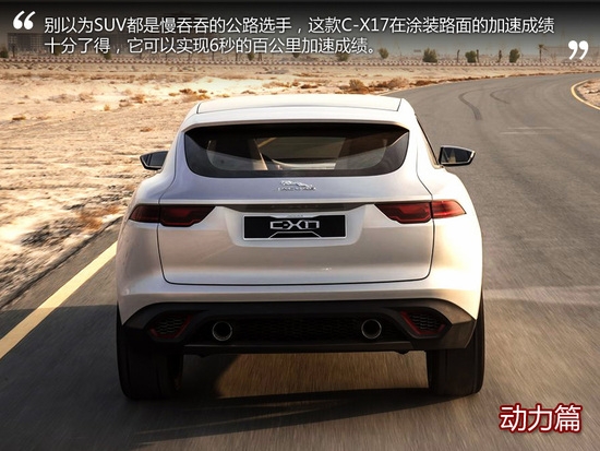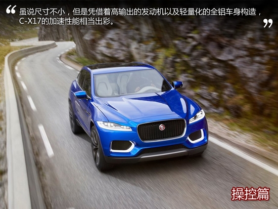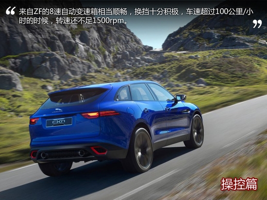近幾年來(lái),捷豹車型在操控方面展現(xiàn)出巨大潛力,C-X17也沒令我們失望。雖說(shuō)尺寸不小,但是憑借著高輸出的發(fā)動(dòng)機(jī)以及輕量化的全鋁車身構(gòu)造,C-X17的加速性能相當(dāng)出彩。