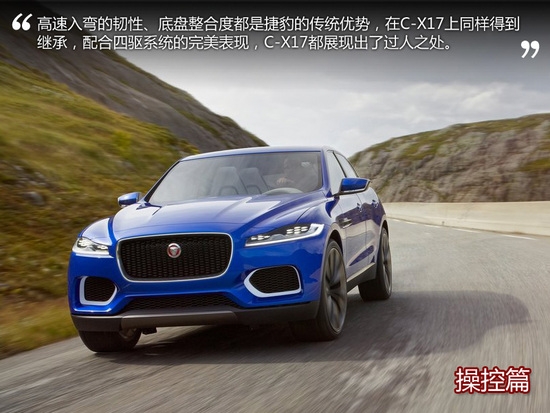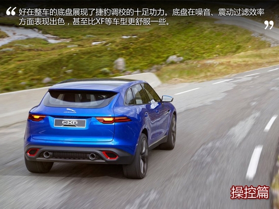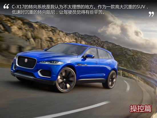 高速入彎的韌性、底盤整合度,這些都是捷豹傳統(tǒng)的優(yōu)勢(shì),在這里C-X17同樣得到了繼承,配合四驅(qū)系統(tǒng)的完美表現(xiàn),無(wú)論是高速入彎,還是高速的緊急變線,C-X17都展現(xiàn)出了過(guò)人之處,其操控風(fēng)格接近于傳統(tǒng)捷豹轎跑,比路虎極光要出色的多,幾乎可以認(rèn)為同Macan不相伯仲,對(duì)于一個(gè)沒有太多SUV制造經(jīng)驗(yàn)的廠商來(lái)說(shuō),捷豹的設(shè)計(jì)確實(shí)體現(xiàn)了大家風(fēng)范。