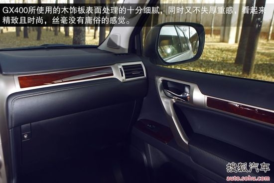 GX400所使用的木飾板表面處理的十分細膩,同時又不失厚重感,看起來精致且時尚,絲毫沒有庸俗的感覺。方向盤同樣保留了木質部分,致使方向盤加熱只能覆蓋3點和9點的真皮部分,加熱速度很快,溫度略高但是不至于燙手。