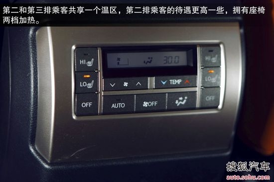 第二排座椅全部采用手動調節,座椅的前后以及靠背仰角有較大的調整范圍。第二排與第三排乘客共享一個空調溫區,第二排乘客的待遇稍高,可以享受兩檔座椅加熱。